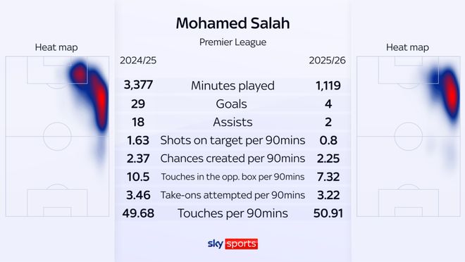 從數據來看,薩拉赫本賽季狀態明顯下滑,場均射門從1.63次下降到0.8次,場均創造機會、對手禁區內觸球、突破次數分別從2.37次、10.5次、3.36次下降到2.25次、7.32次以及3.22次。